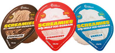 SCREAMIES No-Melt Ice-Scream is made with 100% Australian cream and no artificial colours and flavours for a real creamy ice cream taste.