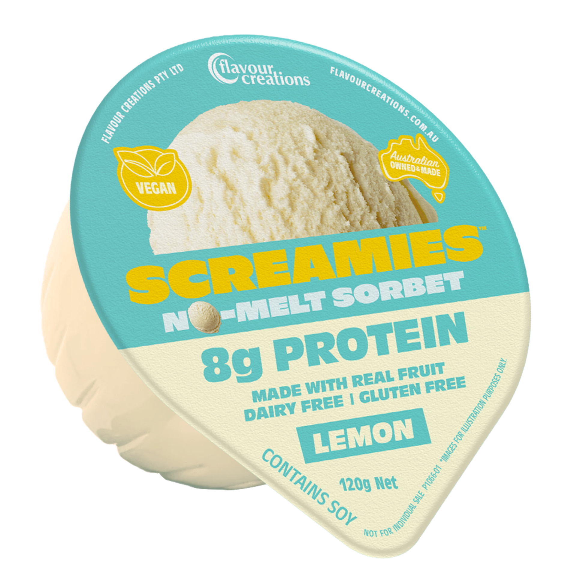 SCREAMIES No-Melt Sorbet Lemon is a zesty, refreshing and nutritious snack made with real fruit and 8g of plant-based soy protein in every serve.