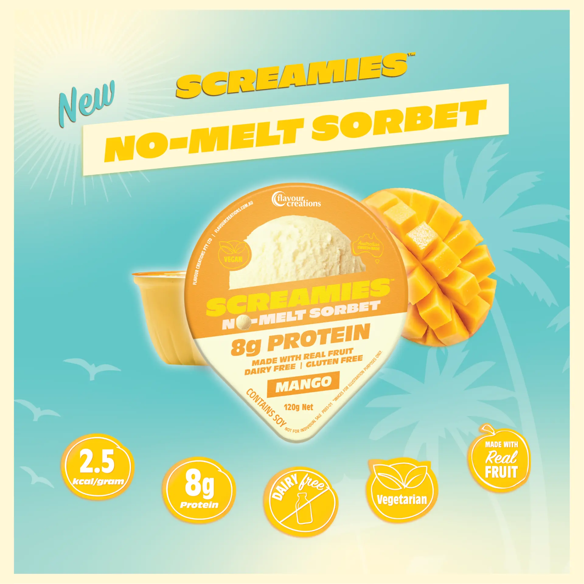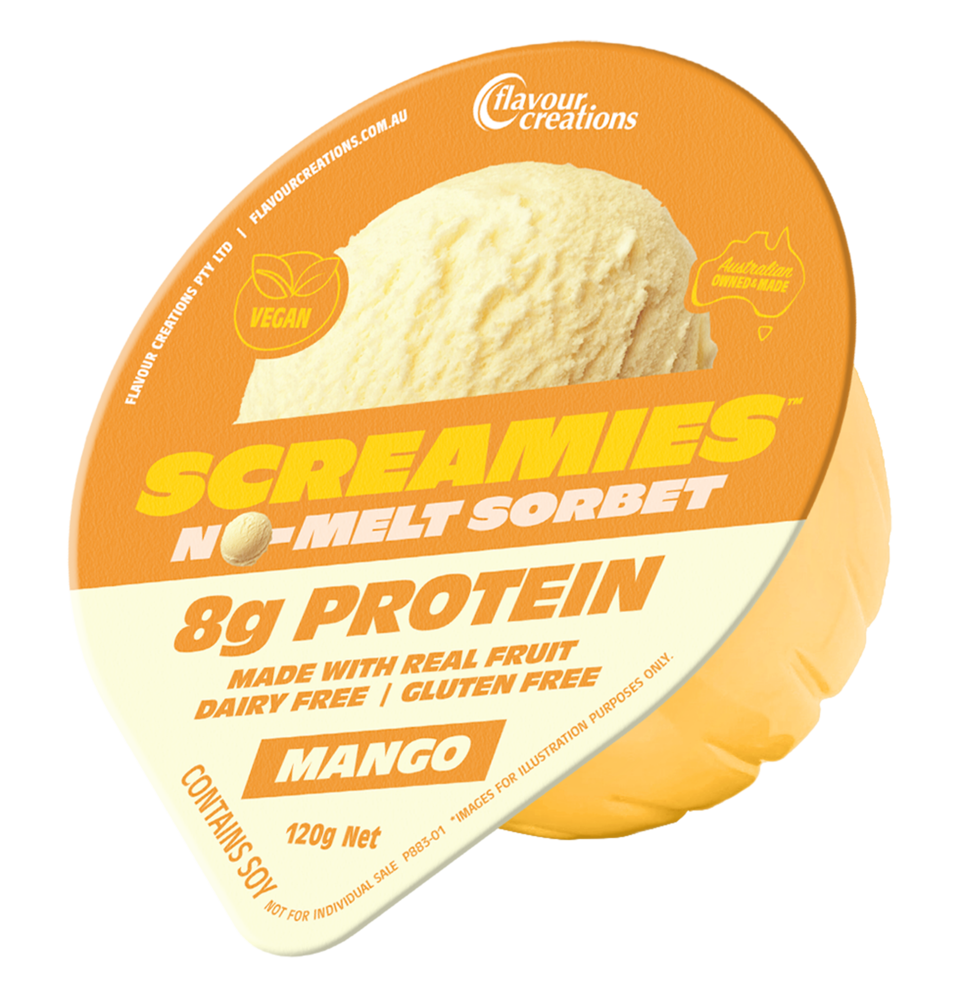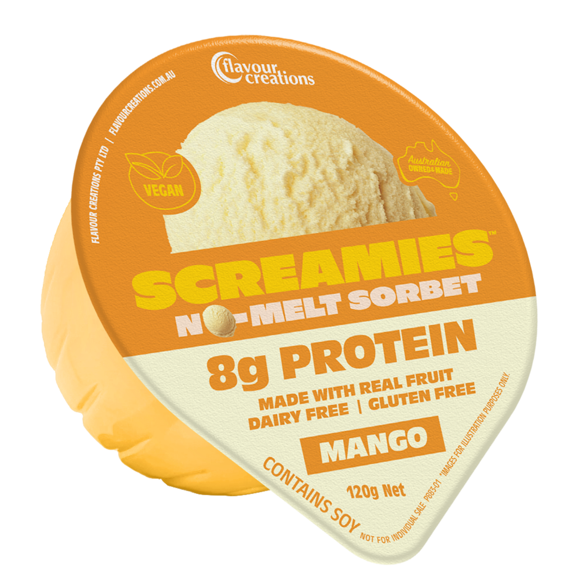 SCREAMIES No-Melt Sorbet Mango is a creamy, tropical and nutritious snack made with real fruit and 8g of plant-based soy protein in every serve.